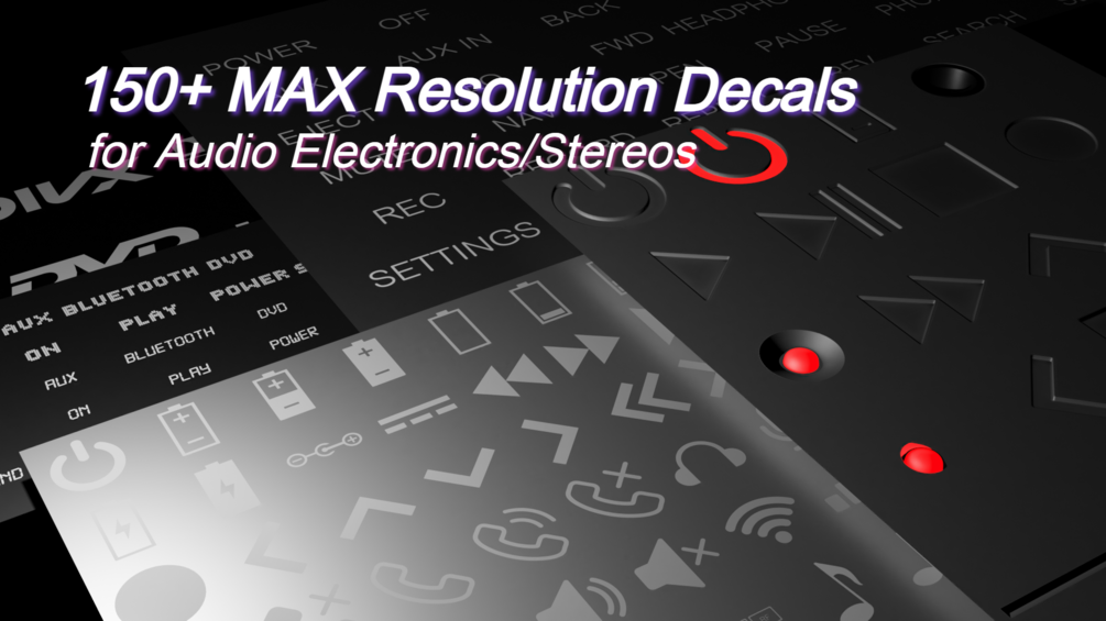 150+ of the best icons, buttons, logos, and indicators associated with modern electronics and media players. Perfect for audio electronics, mp3 players, car stereos, cassette players, walkmans, discmans, etc. All baked at high-quality, max resolution, and perfectly shaded arranged across three decal packs: